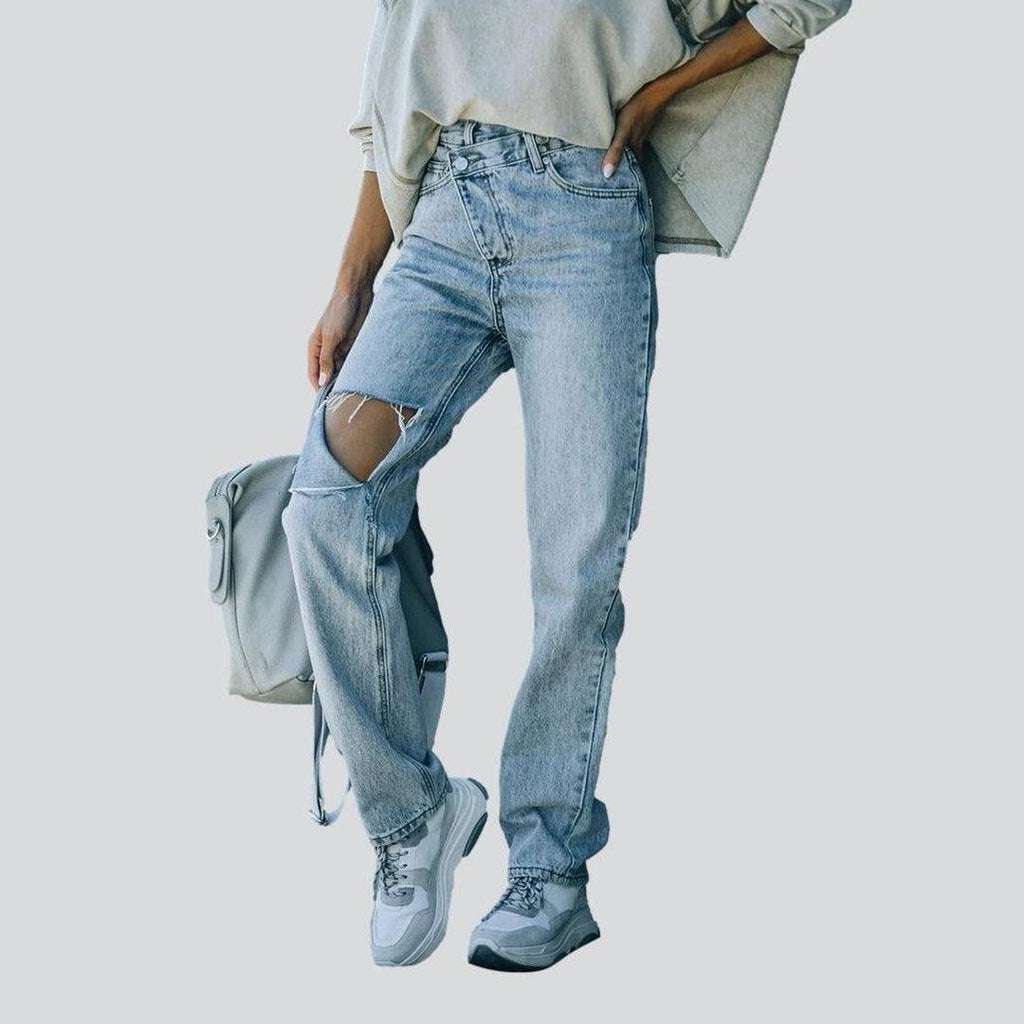 Setzen Sie ein starkes Statement mit unserer asymmetrischen Distressed Wide-Leg Jeans aus der Frühjahr-Sommer-Kollektion 2023! Diese Jeans vereint etablierten Charme und modischen Stil mit einem Underground-Touch, der Sie garantiert aus der Masse hervorstechen lässt. Gefertigt aus hochwertigem Denim, ist diese Jeans der Inbegriff klassischer Eleganz und Luxus. Die mittelhohe Taille und die weite Beinform verleihen einen Hauch von Raffinesse, während der Reißverschluss mit Knopf für einen bequemen Sitz sorgt. Ob gemütlicher Spaziergang oder Galaveranstaltung – mit dieser Jeans ziehen Sie garantiert alle Blicke auf sich.