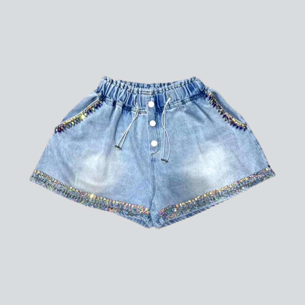Wir präsentieren die Sommerkollektion 2023: lässige Damen-Jeansshorts mit Strassbesatz im Y2K-Trend! Diese Shorts vereinen traditionellen Charme und moderne Mode perfekt und sind ein Must-have für jede Garderobe. Mit größter Liebe zum Detail gefertigt, sind diese Shorts eine Ode an den zeitlosen Charme von Denim.