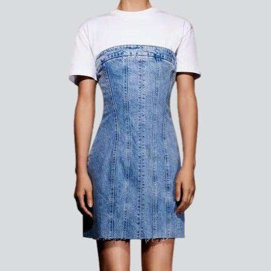 Wir präsentieren das figurbetonte Mini-Jeanskleid aus der Frühjahr-Sommer-Kollektion 2023 im Trend des 20. Jahrhunderts! Dieses zeitlose Stück besticht durch ein klassisches Stonewashed-Finish, einen Reißverschluss und den dehnbaren Stoff, in dem Sie sich wohlfühlen und gut aussehen.