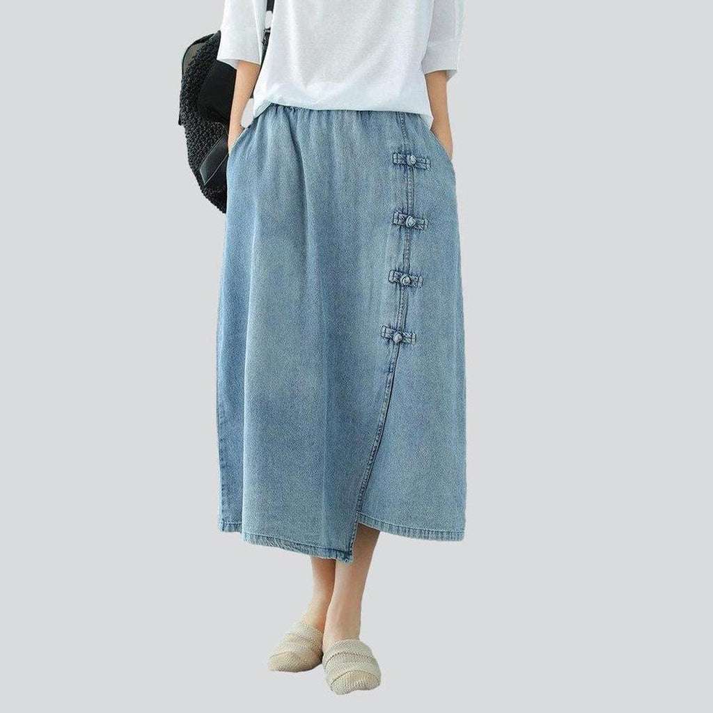 Unser langer Jeansrock im chinesischen Trend wurde speziell für die Fashionista von heute entworfen. Die helle Waschung und die A-Linien-Silhouette sorgen für einen mühelos stylischen Look. Die hohe Taille und der Gummiverschluss sorgen für perfekten Sitz. Ob für eine Dachterrassenparty, ein sonniges Picknick oder einen besonderen Abend – dieser Rock wird Ihr Must-have.
