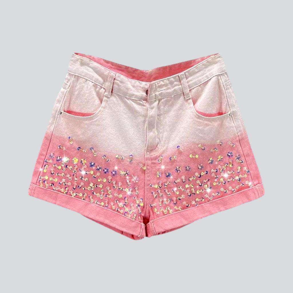 Stehlen Sie diesen Sommer mit unseren pinkfarbenen Strass-Jeansshorts aus der Sommerkollektion 2023 im Rampenlicht. Unsere Shorts mit mittelhohem Bund und weitem Bein, Reißverschluss und Knopfverschluss bieten eine einzigartige Interpretation der Millennium-Mode und lassen Sie mit ihren schillernden Verzierungen aus der Masse hervorstechen. Spüren Sie das mühelose Selbstbewusstsein, während Sie Ihren gewagten Stil mit diesem schicken und klassischen Design zur Schau stellen!
