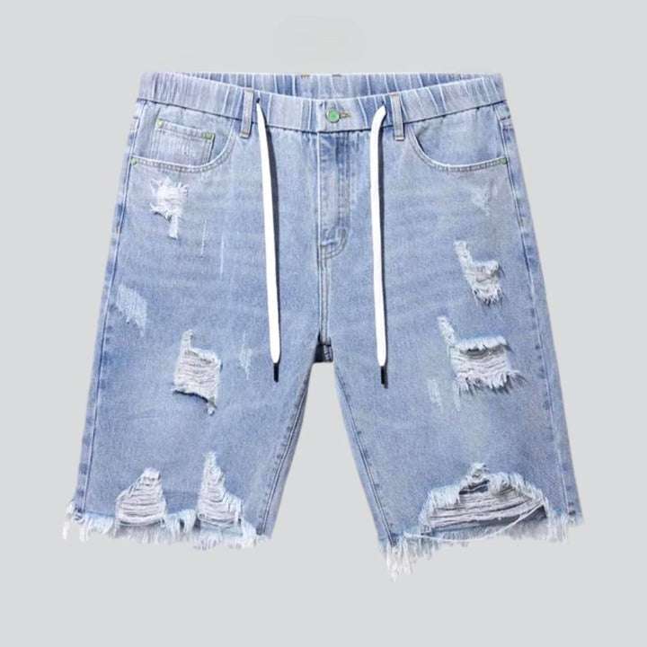 Wir stellen unsere Sommerkollektion 2023 mit zerrissenen Jeansshorts mit Kordelzug vor, perfekt für einen Rock-’n’-Roll-Look!