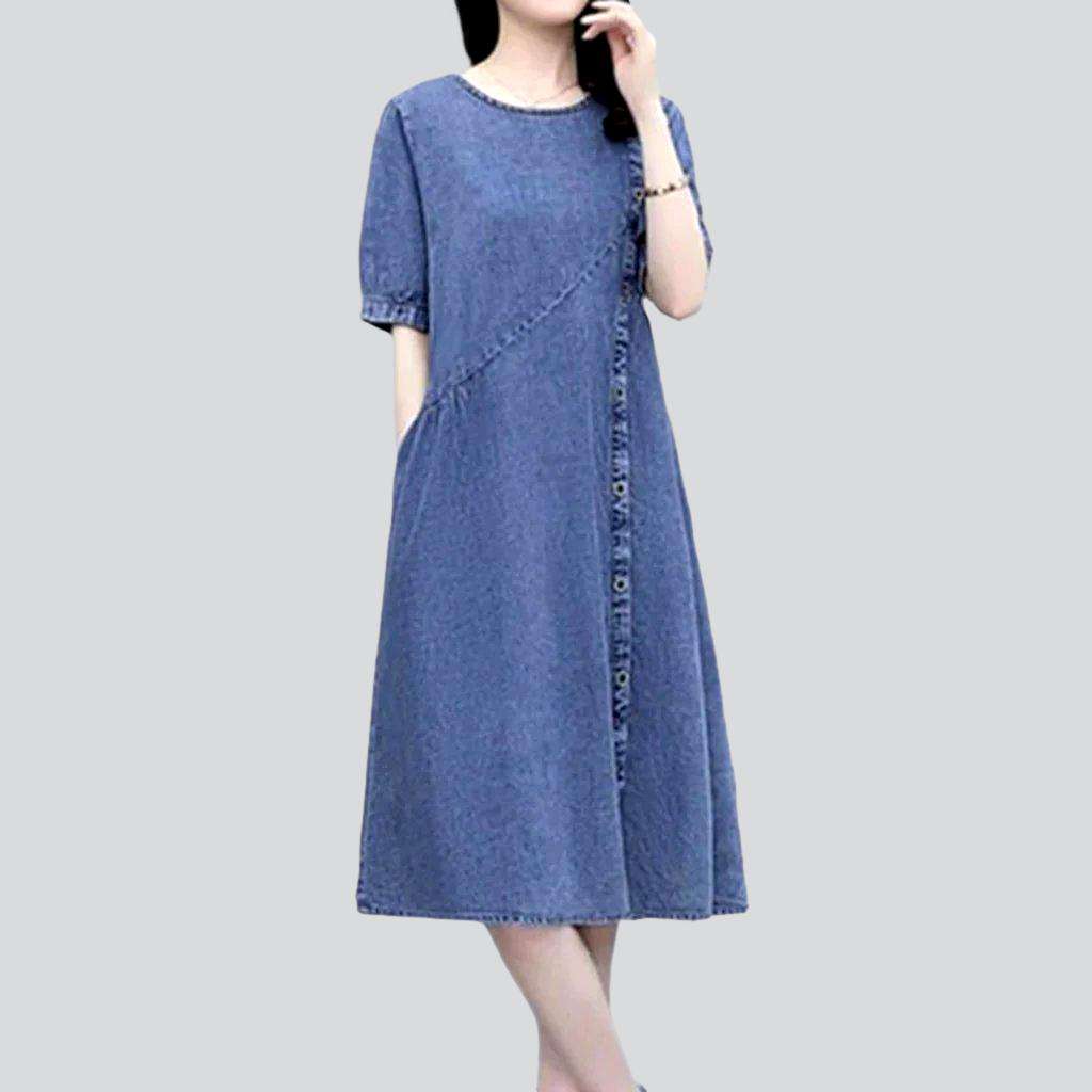 Spüren Sie die Nostalgie der 90er Jahre mit unserem eleganten Jeanskleid mit halblangen Ärmeln aus der Frühjahr-Sommer-Kollektion 2023! Werden Sie zum Trendsetter und feiern Sie die Trend-Renaissance mit diesem stylischen und langlebigen Kleidungsstück, das Sie selbstbewusst und stilvoll aussehen lässt.