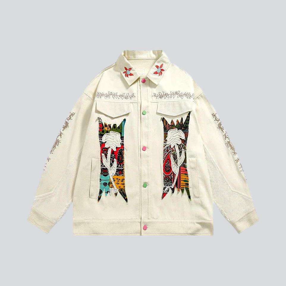 Verleihen Sie Ihrer Garderobe mit unserer elfenbeinfarbenen, bestickten Herren-Jeansjacke im Boho-Stil aus der Frühjahr-Sommer-Kollektion 2023 einen mühelos stilvollen Touch. Eine harmonische Mischung aus Vintage-inspiriertem Charme und moderner Mode. Dieses übergroße, bestickte Meisterwerk mit Knopfverschluss verleiht Ihrem Alltagslook einen Hauch zeitloser Eleganz!