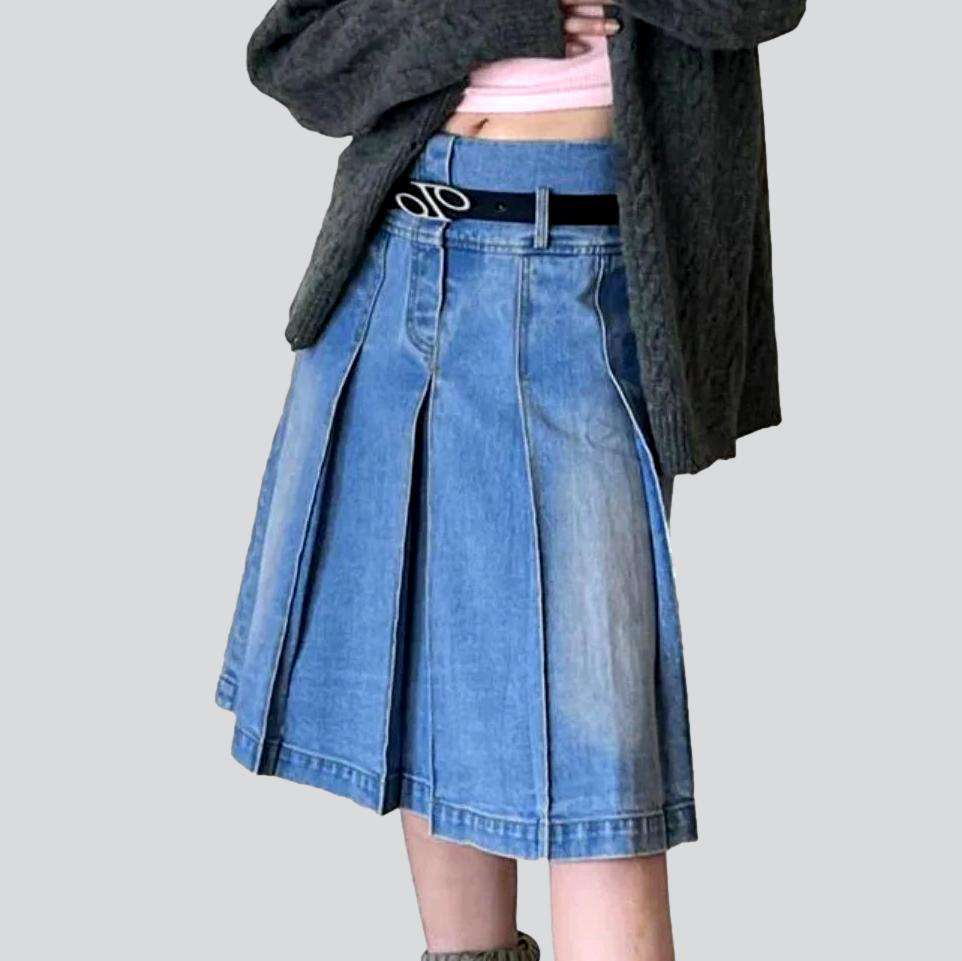 Wir präsentieren den knielangen, plissierten Jeansrock der Frühjahr-Sommer-Kollektion 2023. Ein Must-have für jede Fashionista, die ein Statement setzen möchte! Diese moderne, hoch taillierte Version des 90er-Jahre-Klassikers besticht durch eine helle Waschung, Midi-Länge und Reißverschluss – perfekt für jeden Anlass.