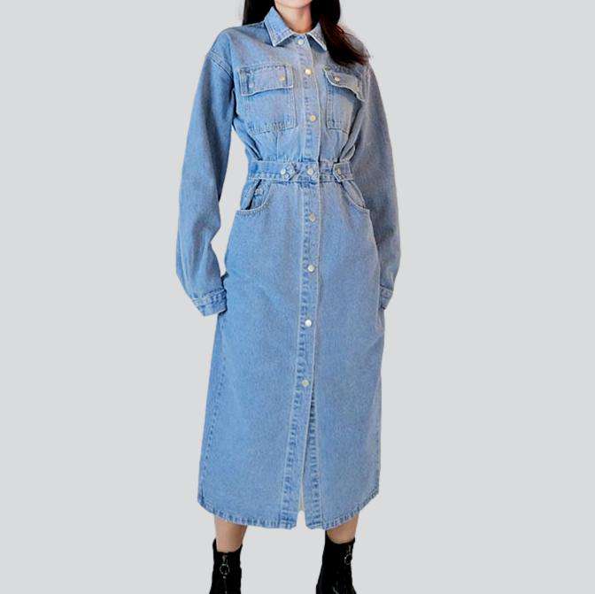 Wir präsentieren den hellblauen langen Jeansmantel aus der Frühjahr-Sommer-Kollektion 2023 – ein zeitloser Klassiker mit einem Hauch von Modernität!
