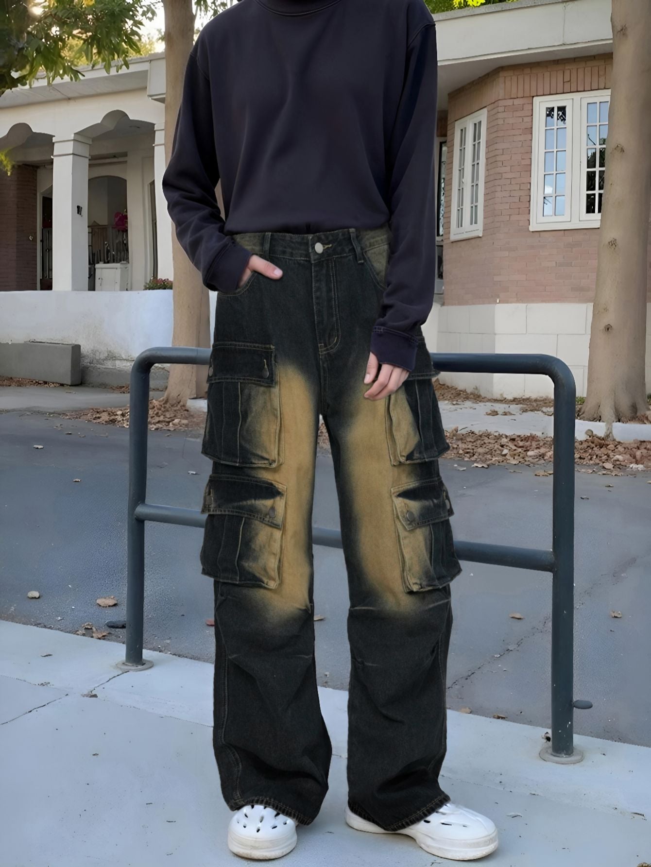 Loose straight-leg multi-pocket wide-leg jeans
