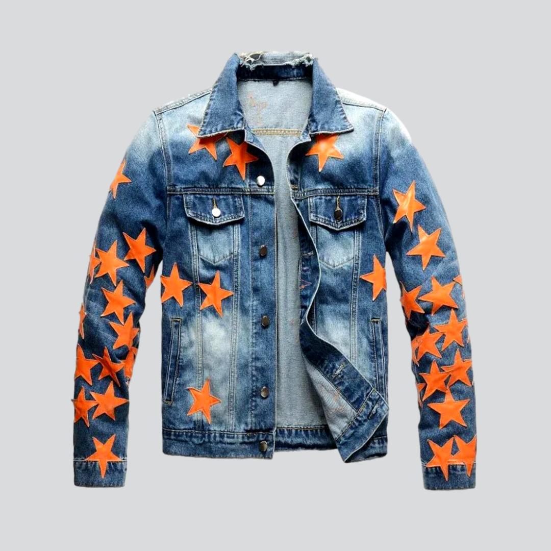 Mit dieser Vintage- Jeansjacke mit orangefarbenen Sternen aus unserer Frühjahr-Sommer-Kollektion 2023 triffst du mühelosen Style! Dieses von der Jahrhundertwende inspirierte Stück ist perfekt für alle, die mit ihrer Couture-Wahl ein Statement setzen möchten. Die reguläre Passform und der Knopfverschluss machen sie zu einem zeitlosen Design. Das gestickte Muster verleiht ihr einen Hauch von Luxus und Glamour.