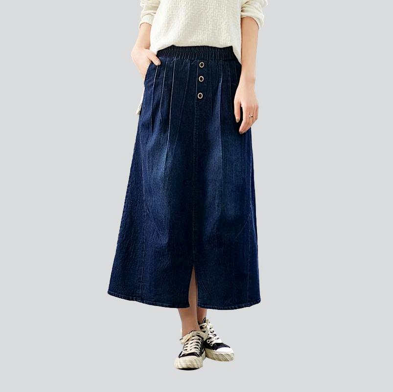 Dieser klassische A-Linien-Schnitt ist aus dunkel gewaschenem, zerrissenem Denim gefertigt und besticht durch seinen mühelosen Vintage-Look. Mit seiner hohen Taille und dem Gummiverschluss ist dieser Rock für maximalen Komfort und Stil gemustert. Die Falten verleihen dem Rock einen Hauch von Raffinesse und verleihen ihm einen klassischen Look, der sowohl elegant als auch leger getragen werden kann.