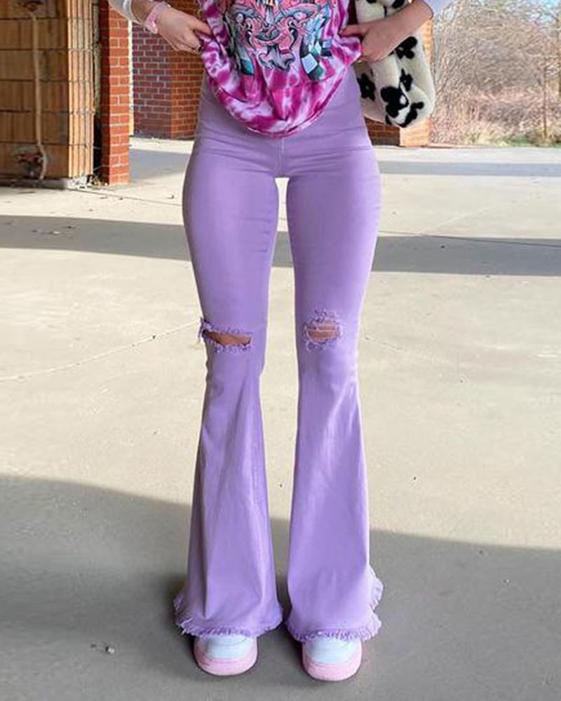 Einfarbige Jeans mit Schlag und Rissen, offenem Saum und Taschendetail