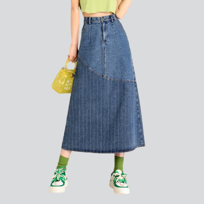 Fangen Sie die Essenz des Sommers mit unserem langen Jeansrock im gestreiften Patchwork-Stil im Y2K-Stil aus der Frühjahr-Sommer-Kollektion 2023 ein! Von der A-Linien-Form bis zum luxuriösen Denim-Material strahlt dieses Stück Vintage-Charme und modernen Modetrend aus. Mit erhöhter Taille und Reißverschluss und Knopfverschluss ist dieser Rock so konzipiert, dass Sie tadellos aussehen und sich auch so fühlen – ein wahrer Ausdruck von Trend als Kunst.