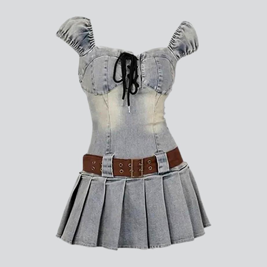 Wir präsentieren das plissierte Mini-Jeanskleid im Vintage-Stil aus der Sommerkollektion 2023 – ein zeitloses Klassikerkleid mit Couture-Touch!
