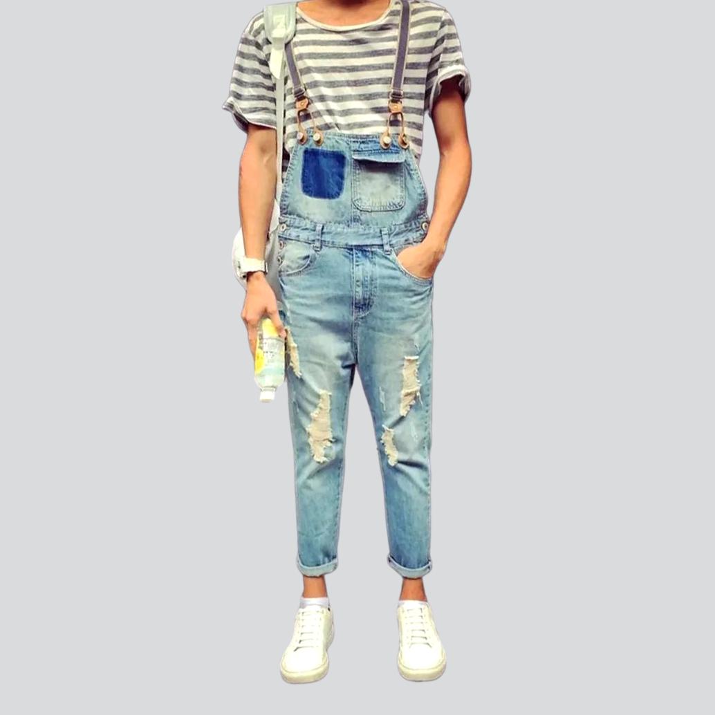 Machen Sie sich bereit, den urbanen Stil mit diesem kurzen Retro- Jeans-Jumpsuit für Herren aus unserer Frühjahr-Sommer-Kollektion 2023 auf das nächste Level zu heben! Mit Distressed-Details, einer schlanken Silhouette, Hosenträgern und Knopfverschluss ist dieser Jumpsuit perfekt für einen zeitlosen Look mit modernem Touch.