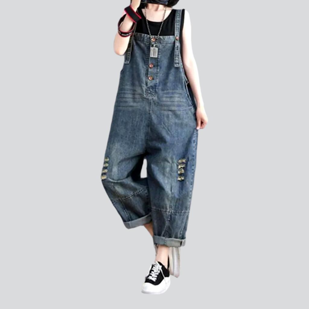 Peppen Sie Ihren Stil diesen Sommer mit unserem Vintage-inspirierten Damen-Jeans-Jumpsuit mit Whiskers aus der Frühjahr-Sommer-Kollektion 2023 auf. Mit lockerer Passform, auffälligem Hosenträgerverschluss und Used-Look-Details hebt dieser Jumpsuit Sie von der Masse ab.