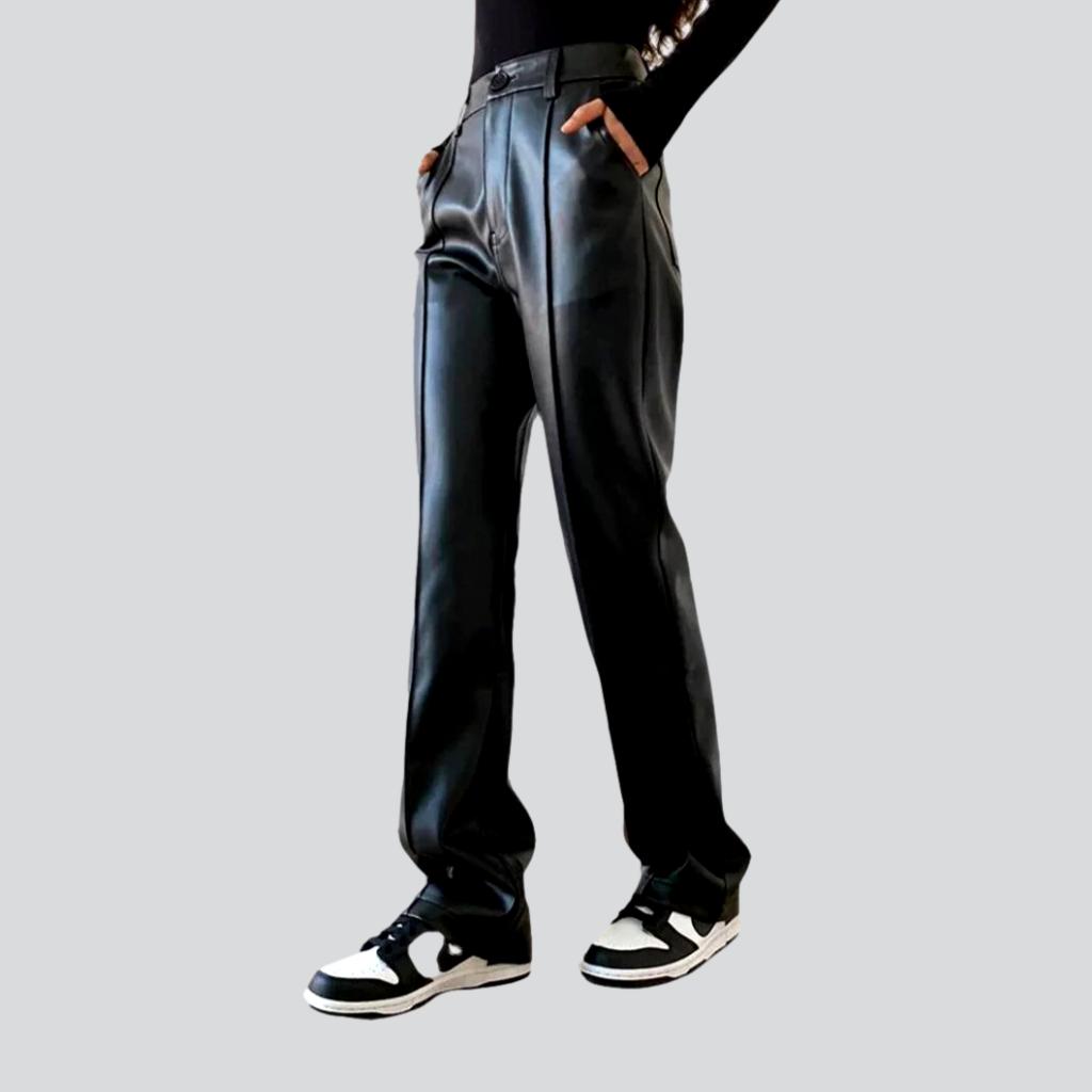 Wir präsentieren unsere schwarze Y2K-Jeanshose für Damen aus der Herbst-Winter-Kollektion 2023 – ein Must-have für alle, die sich gerne von der Masse abheben! Diese Jeans hat ein gewachstes, gerades Bein im Y2K-Stil, eine hohe Taille, Vordernähte und einen Reißverschluss mit Knopfverschluss für einen zeitlosen und dennoch stilvollen Look.