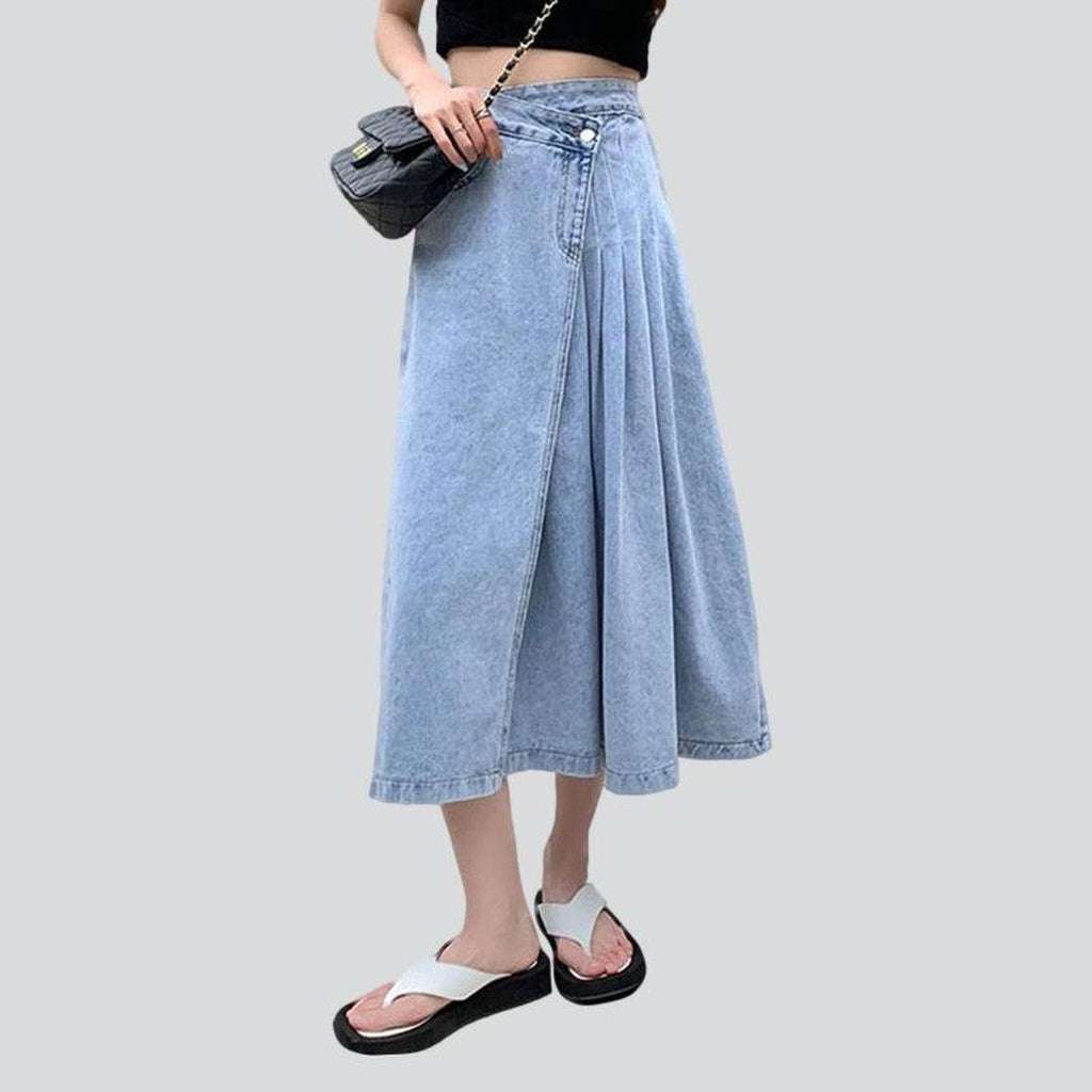 Esta falda es perfecta para la fashionista moderna con atención al detalle. Su corte vanguardista, con un lavado claro, cintura alta y un estilo desequilibrado, la convierte en la prenda perfecta para crear un look tradicional.