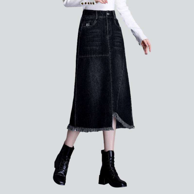 ¡Bienvenidos a la Colección Otoño 2023! Sumérgete en los 90 con esta falda vaquera oscura, moderna y atemporal. Con cintura alta, cierre de cremallera y botón, y bajo irregular, esta falda con lavado efecto piedra es una combinación clásica de estilo icónico y moderno.