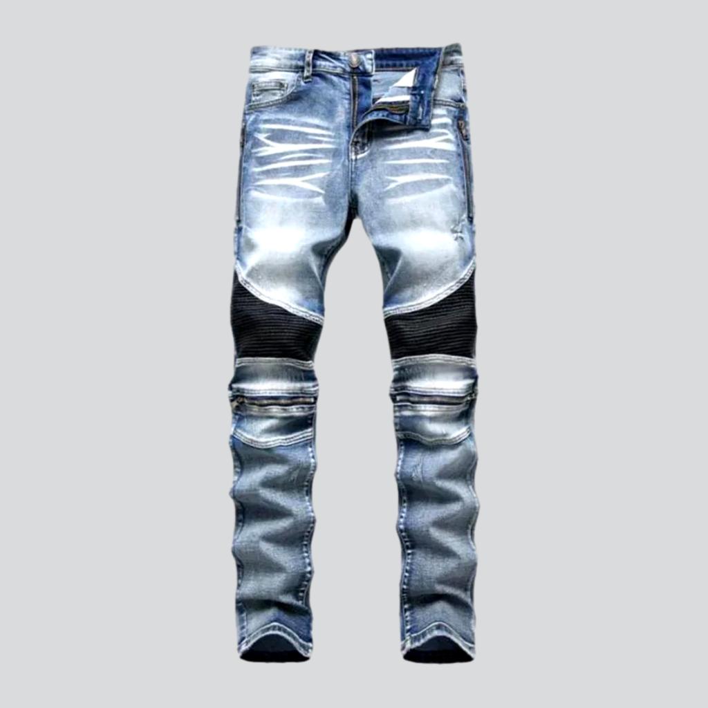 Presentamos nuestros jeans biker lijados para hombre de la colección primavera-verano 2023, una incorporación de alta costura y elegancia a tu guardarropa con un inconfundible toque Y2K.