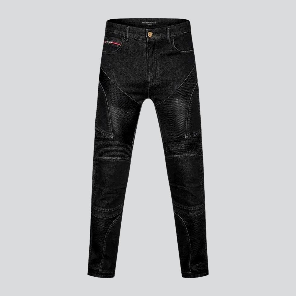 Lleva tu estilo al siguiente nivel con estos jeans estilo motero con efecto lavado a la piedra para hombre de la Colección de Verano 2023. Este diseño ajustado está confeccionado con tejido transpirable y cuenta con rodilleras protectoras. Tiene tiro medio y cierre de cremallera y botón. ¡Úsalos en cualquier ocasión y disfruta de una comodidad y protección inigualables!