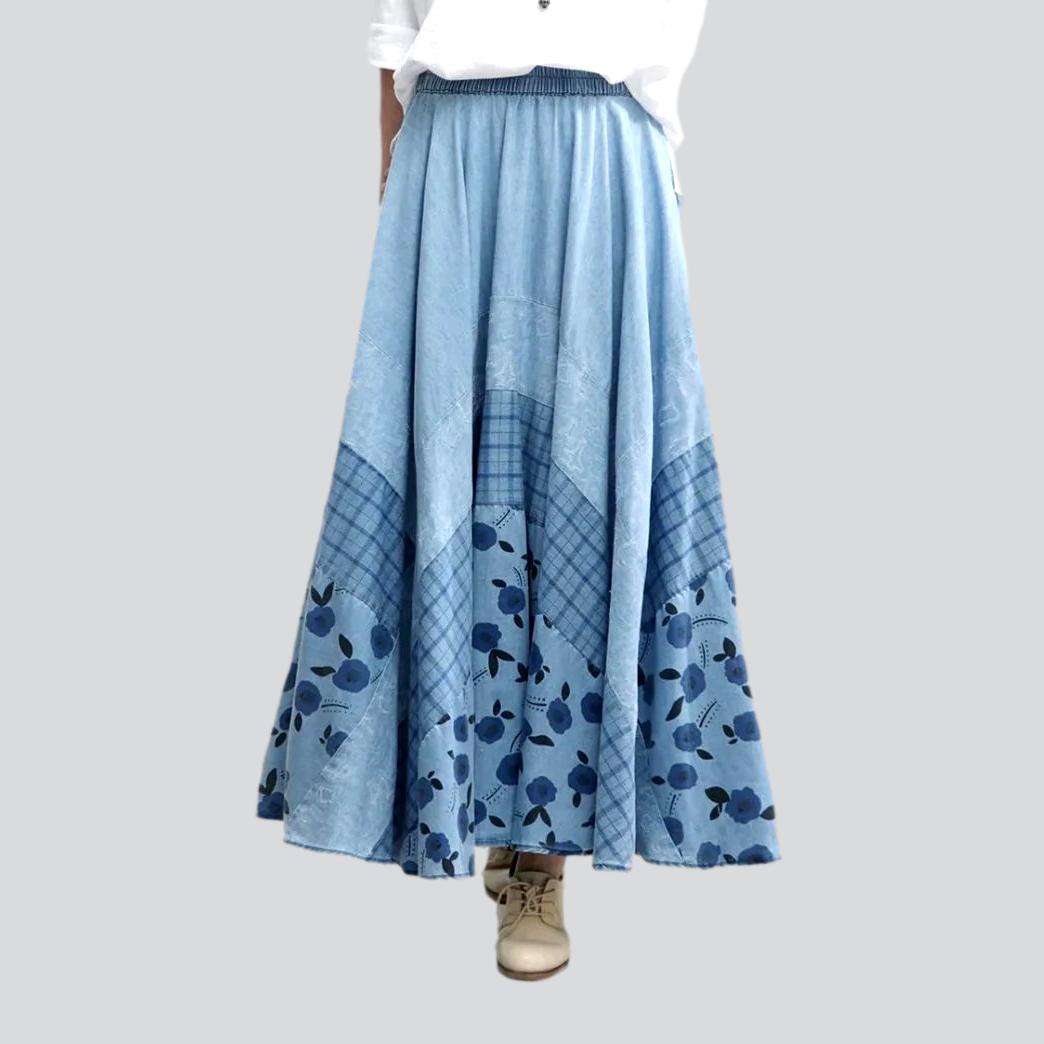 Experimenta el estilo bohemio chic con nuestra falda vaquera azul claro de la colección Primavera-Verano 2023, que combina tendencia natural con una sutil sofisticación. Esta falda larga de cintura alta está cosida con estampados gitanos y cuenta con un cierre de goma. Características distintivas: