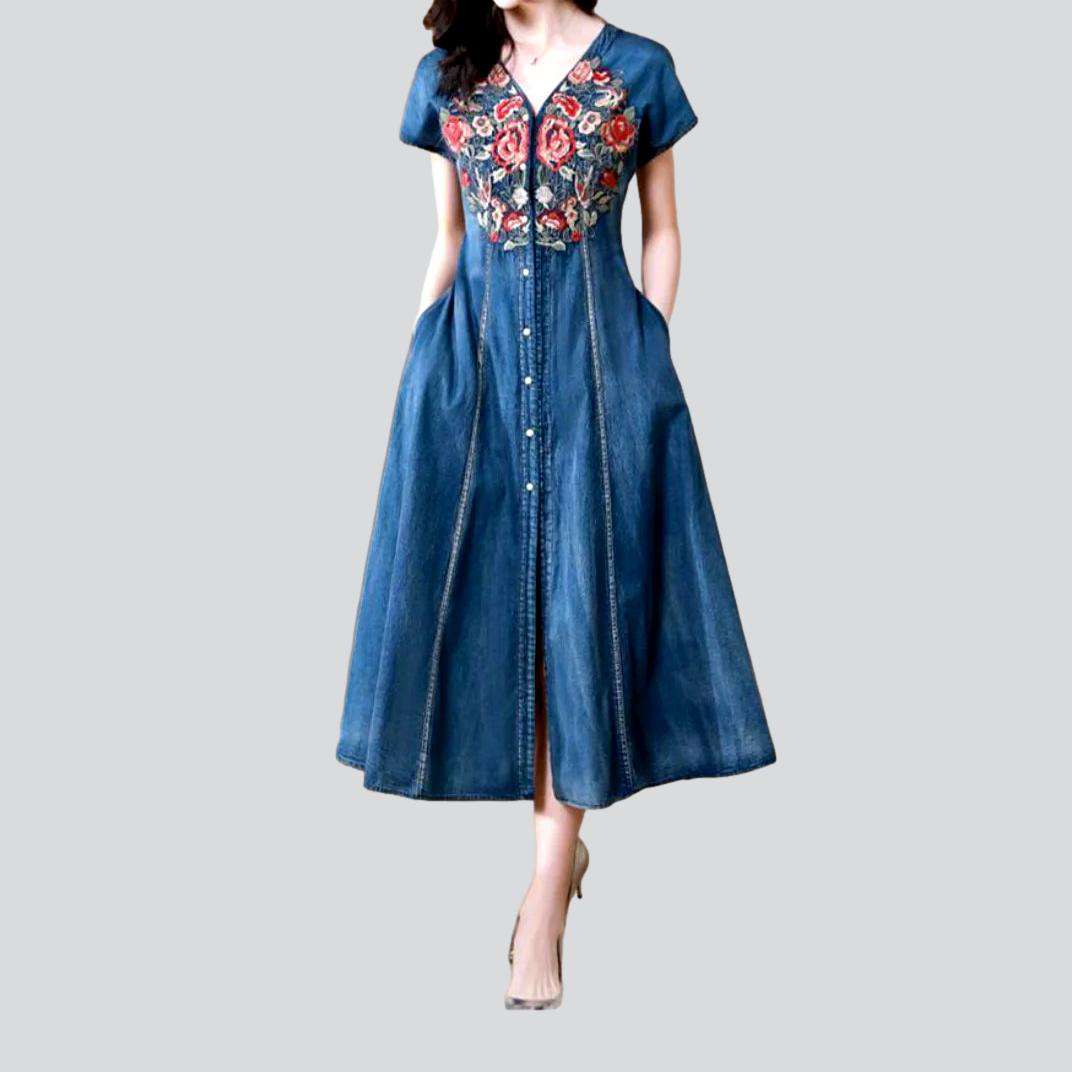 Lleva tu armario al siguiente nivel con este vestido vaquero de estilo urbano con bordado en el pecho de nuestra colección Primavera-Verano 2023. Este vestido entallado y con vuelo sin duda llamará la atención con su diseño atrevido y urbano. Se completa con un cierre de botones.