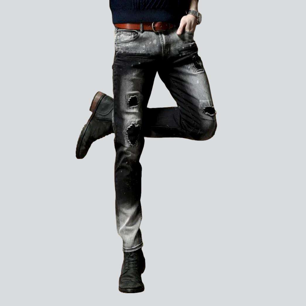 Presentamos los jeans ajustados con efecto blanqueado en contraste para hombre de la colección de otoño de 2023, ¡una obra maestra de estilo rudo que irradia sofisticación eterna!