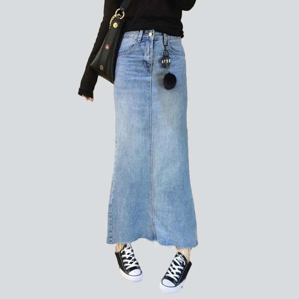 ¡Adéntrate en los 90 con estilo y elegancia con nuestra falda vaquera larga con borde de silueta de la colección Primavera-Verano 2023! Esta prenda atemporal le da un toque moderno a un diseño clásico. Presenta un lavado claro, cintura alta, cierre de cremallera y botón, y está confeccionada en tejido elástico para mayor comodidad.