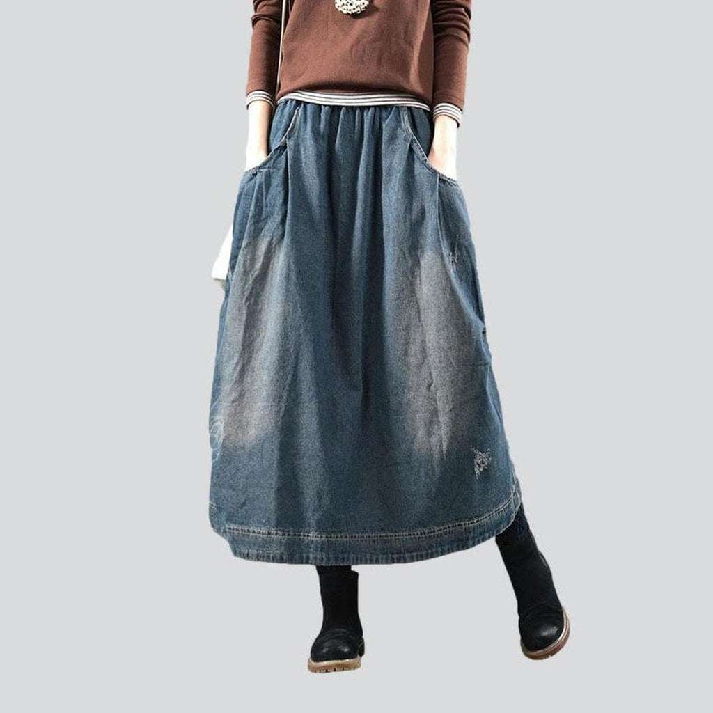 Haga una declaración con nuestra falda de mezclilla larga , de cintura alta y lavado oscuro con cierre de cordón de la colección Primavera-Verano 2023: ¡la máxima expresión del estilo urbano callejero!
