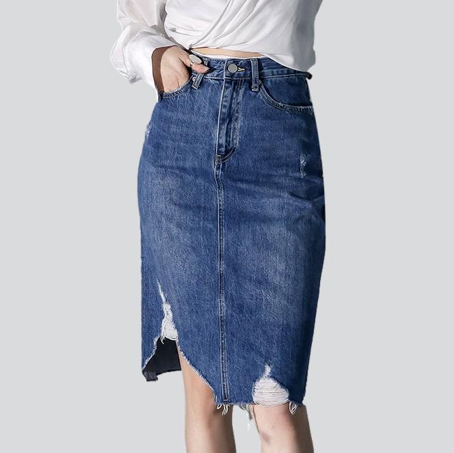 Presentamos la falda vaquera hasta media pantorrilla con dobladillo desgastado estilo grunge de la colección Primavera-Verano 2023: ¡una declaración de moda para el nuevo milenio!