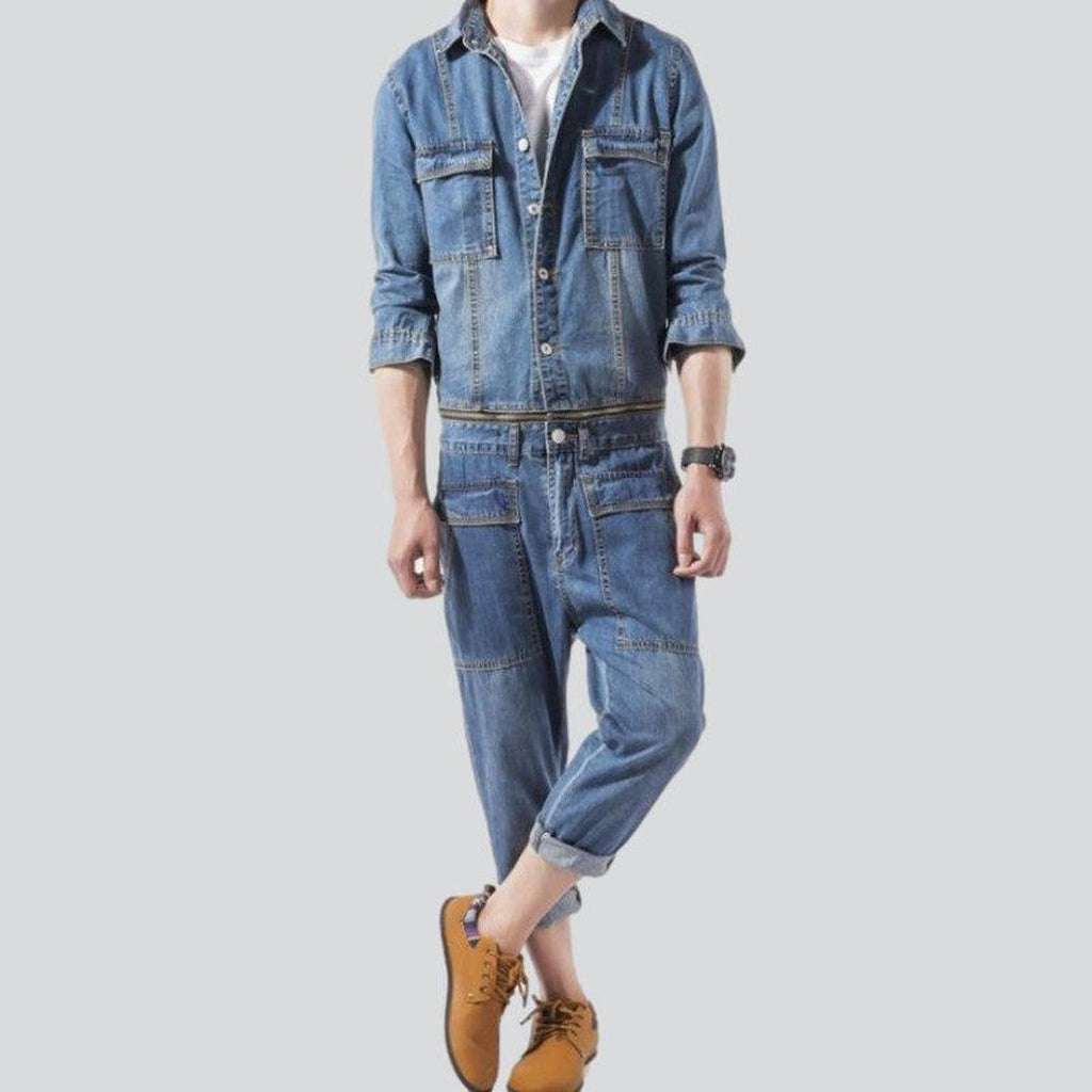Marca tendencia con nuestro mono de mezclilla dubble con lavado medio y efecto Y2K para hombre de la colección Primavera-Verano 2023. Con su silueta entallada, acabado lijado y vibrantes estampados pintados, esta prenda atemporal promete transformar tu look en una obra maestra atemporal.