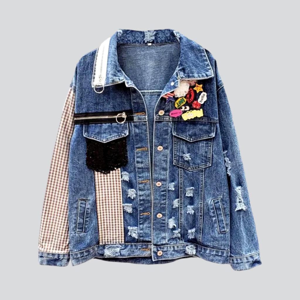 ¡Consigue un look atemporal con lachaqueta vaquera adornada de la colección de primavera 2023 para mujer! Esta prenda, tendencia Y2K, combina a la perfección lo clásico y lo moderno. Presenta una combinación de tejidos, una silueta oversize y detalles rotos. Además, se completa con un estampado adornado y un cierre abotonado.