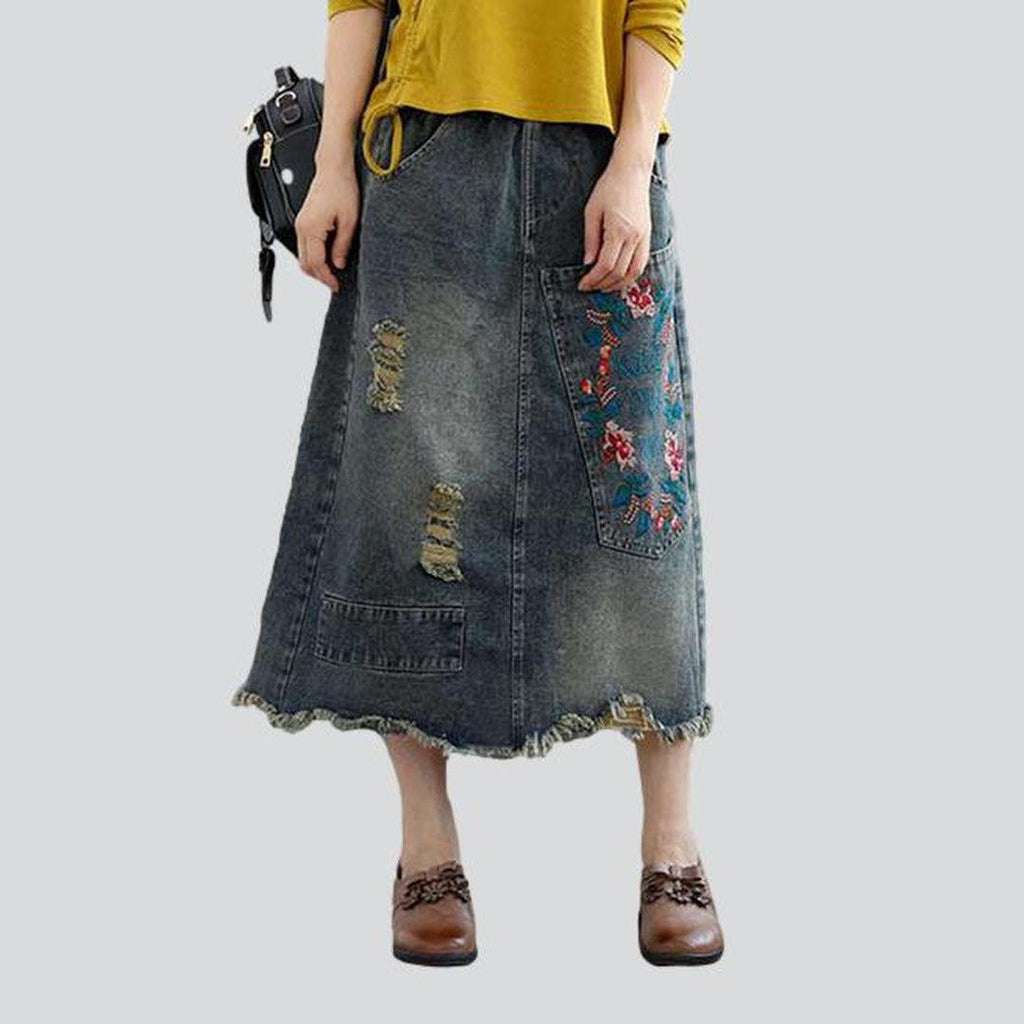Presentamos la colección Primavera-Verano 2023, un vibrante homenaje a la escena de la moda Y2K con nuestra falda vaquera bordada, larga, de cintura alta y rasgada para mujer .