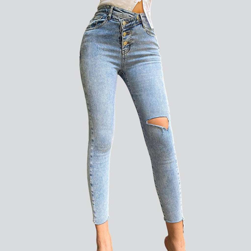 Presentamos nuestra colección Primavera-Verano 2023 de jeans desgastados, ajustados, de cintura alta y estilo grunge con botones desequilibrados a la vista. ¡Siéntete elegante y con estilo con este diseño único que combina el encanto vintage con un toque moderno!