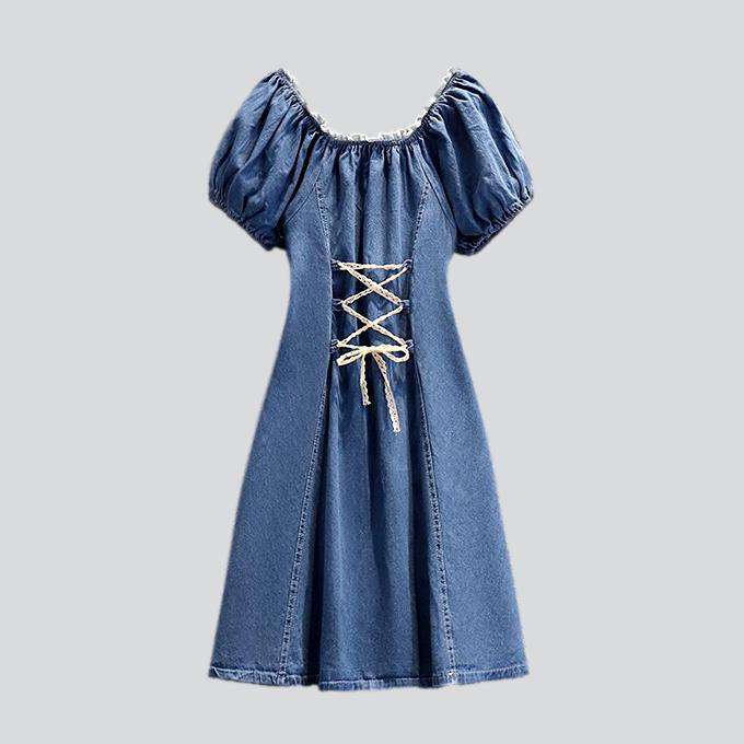 ¡Marca tendencia esta temporada con el vestido vaquero acampanado de estilo urbano con cordones de la Colección Primavera-Verano 2023! Este elegante vestido con cierre de cremallera es la combinación perfecta de alta costura contemporánea y elegancia natural. Con una favorecedora silueta entallada y acampanada, un atrevido estampado roto y detalles ornamentales únicos, ¡este look sin duda llamará la atención!