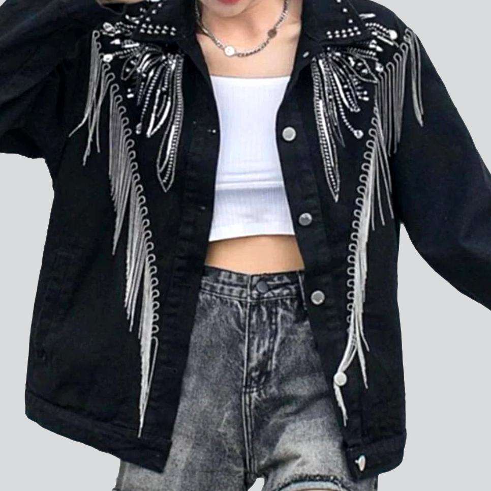 Presentamos nuestra chaqueta vaquera negra con flecos para mujer de la colección primavera-verano 2023: ¡la máxima expresión de la elegancia Y2K!