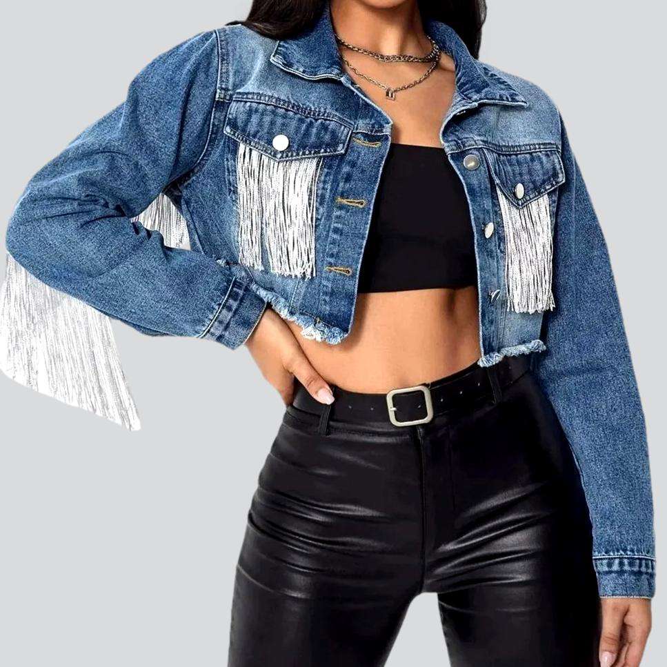 Para los más vanguardistas. Por los más vanguardistas: ¡mejora tu guardarropa hoy con esta chaqueta vaquera corta con flecos!