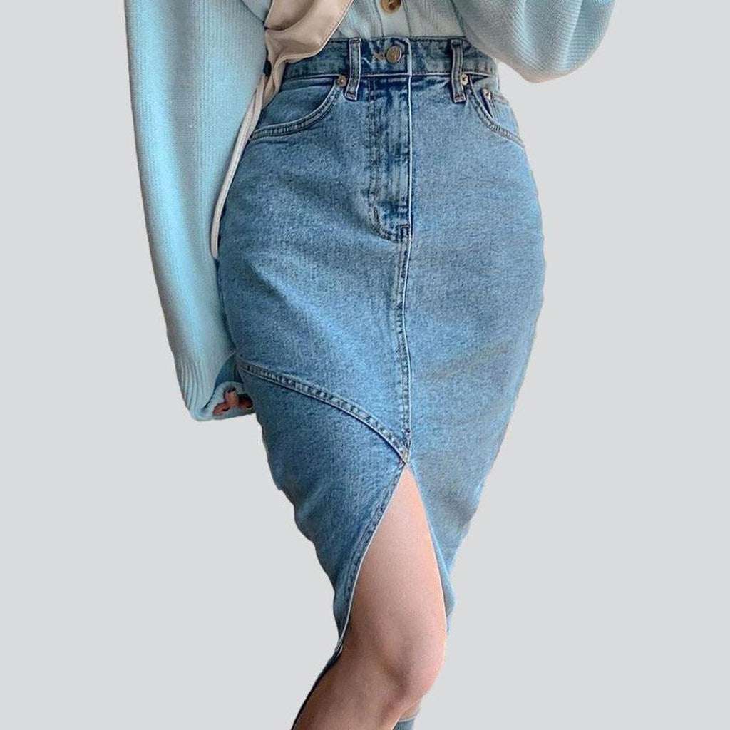 ¡Resalta tu estilo noventero con nuestra colección Primavera-Verano 2023 de faldas vaqueras de cintura alta con abertura frontal para mujer ! Confeccionada con denim de lavado claro de primera calidad, esta obra maestra grunge es la combinación perfecta de tendencia contemporánea y nostalgia.