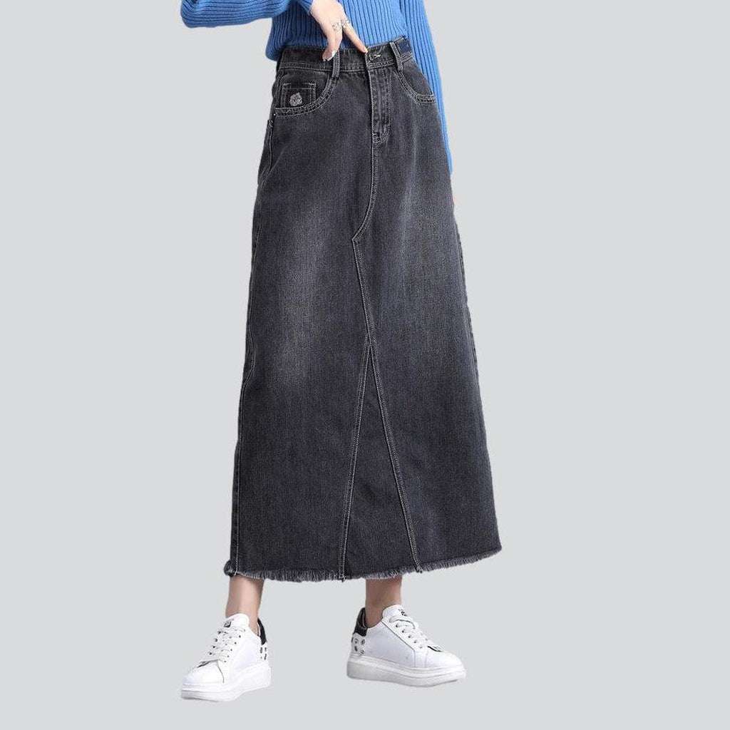 ¡Revive los años noventa con nuestra falda vaquera larga gris de la colección Otoño 2023, un clásico atemporal reinventado para un guardarropa de alta costura!