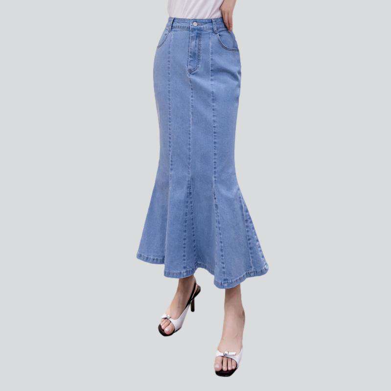 Dale vida a tu colección de mezclilla con la falda vaquera larga de sirena y tiro alto de la colección Primavera-Verano 2023. La personificación del estilo urbano. Esta falda de lavado claro es la combinación perfecta de moda contemporánea y nostalgia. ¡Lleva tu look a otro nivel!