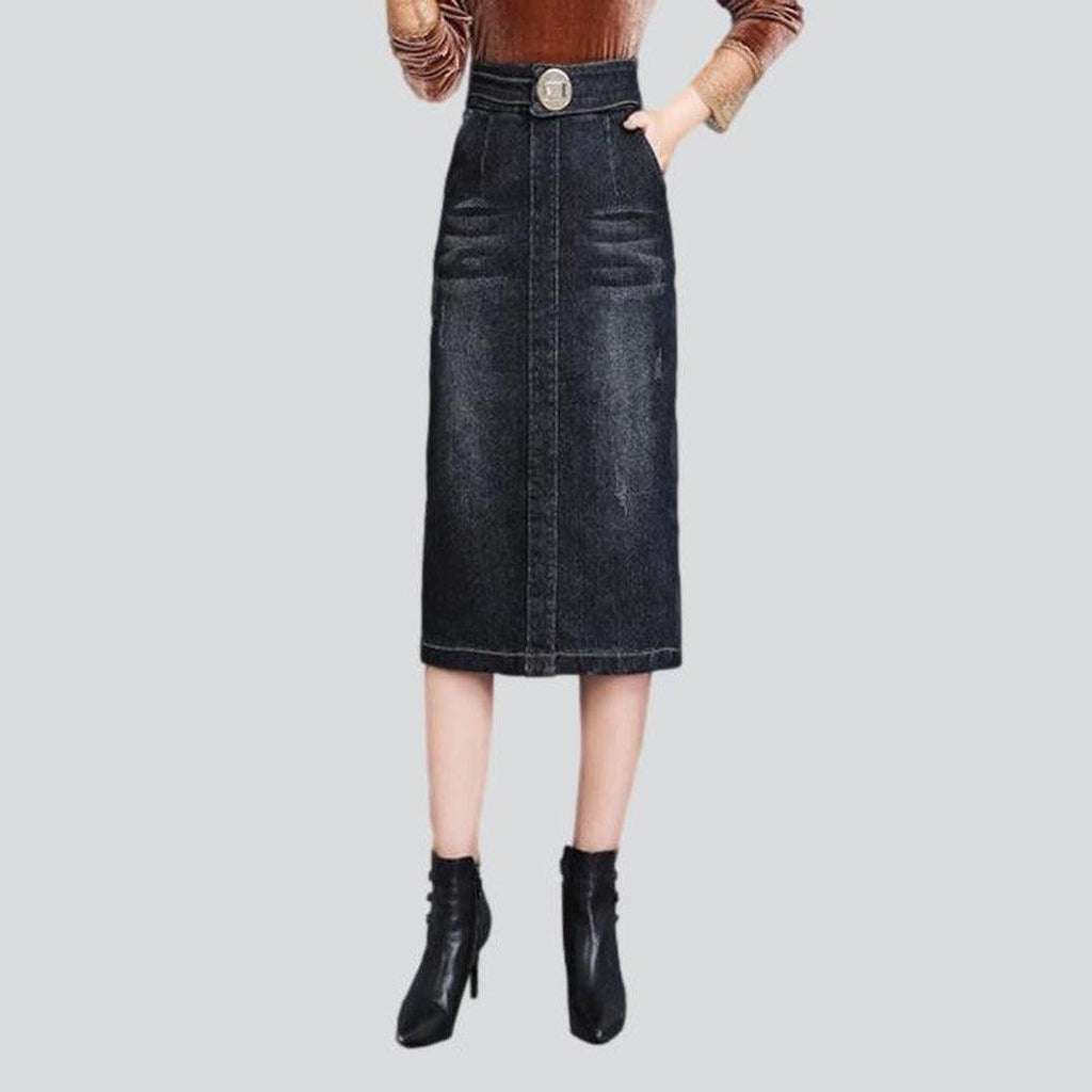 Haz una declaración y destaca entre la multitud con nuestra falda vaquera de cintura alta hasta la rodilla de la colección de otoño de 2023 que rinde homenaje a la moda de los 90.