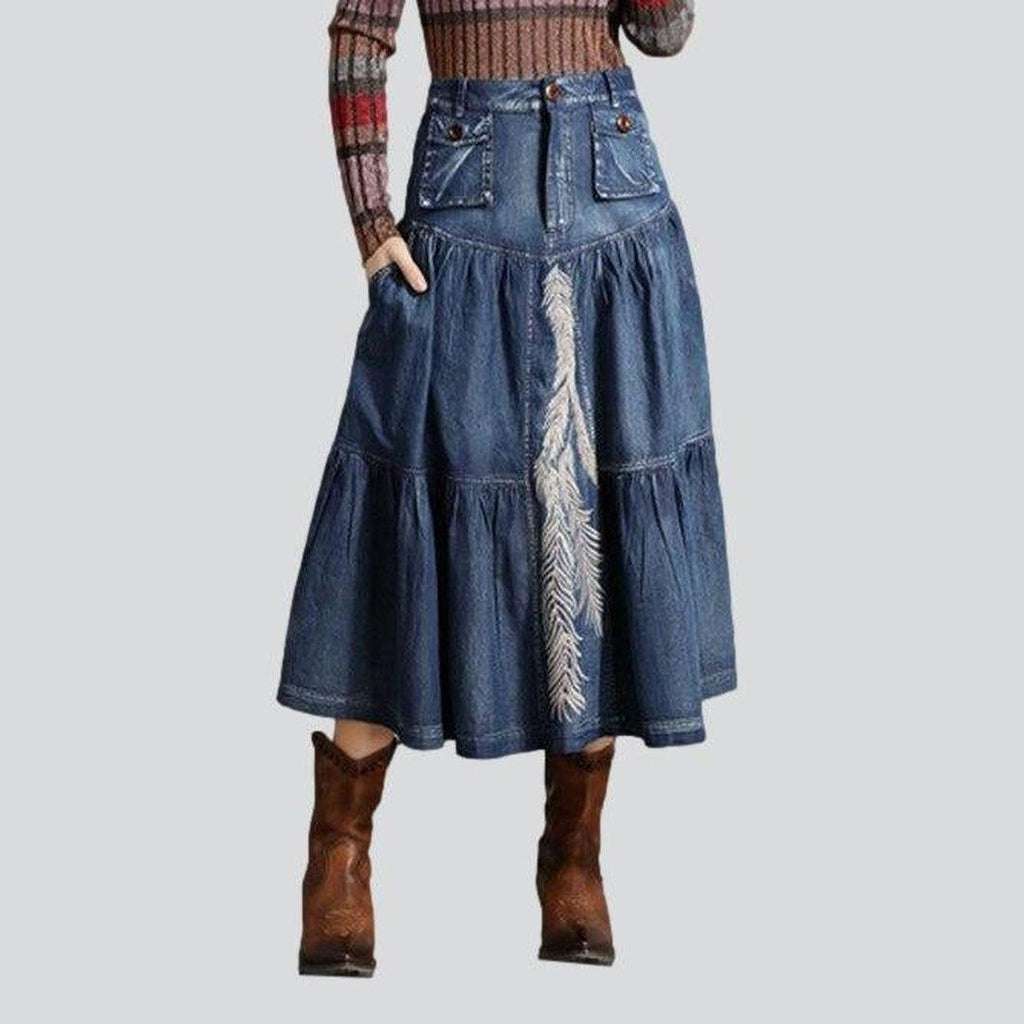 ¡Descubre tu estilo inspirado en el Y2K con nuestra falda vaquera larga estilo indio de la colección Otoño 2023! Esta falda vaquera presenta una silueta de cintura alta con dobladillo escalonado y detalles bordados que le dan un look vintage único. El cierre de cremallera y botón garantiza un ajuste perfecto y su acabado con textura lijada le da un toque de estilo. ¡Regresa al pasado y abraza la moda moderna con esta obra maestra atemporal!