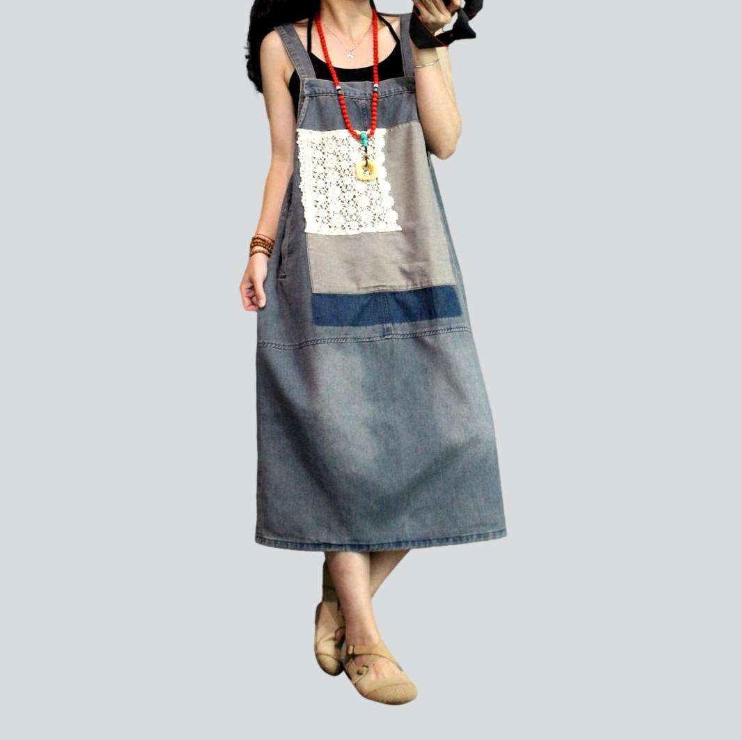 Una versión de alta costura de la tendencia moderna del año 2000. Este vestido largo de mezclilla está diseñado para que te veas y te sientas increíble. Adornado con intrincados detalles de encaje, ¡cautivarás todas las miradas dondequiera que vayas! Con su cierre de presión y su diseño estilizado, será tu vestido ideal para cualquier ocasión.