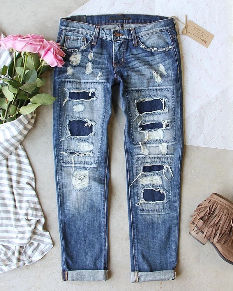 Jeans de cintura baja con parches desgastados y diseño de escalera