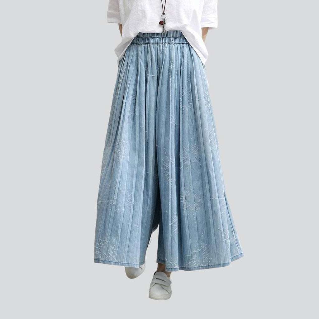 Retrocede a los años 2000 con nuestros pantalones vaqueros culotte de lavado claro de la colección Primavera-Verano 2023, inspirados en el Y2K. Con bordados de tendencia vintage, cintura alta y cierre de goma, estos pantalones son la personificación de la moda chic sin esfuerzo. Características distintivas: