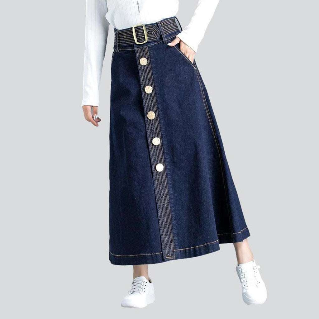 La Colección Otoño 2023 te trae un clásico atemporal con un toque de alta costura: la falda larga con botones grandes. Sumérgete en un mundo de elegancia y tendencia con esta prenda de estilo urbano. Con costuras en contraste, corte entallado y evasé, cintura alta y cierre de hebilla. ¡Prepárate para causar sensación!