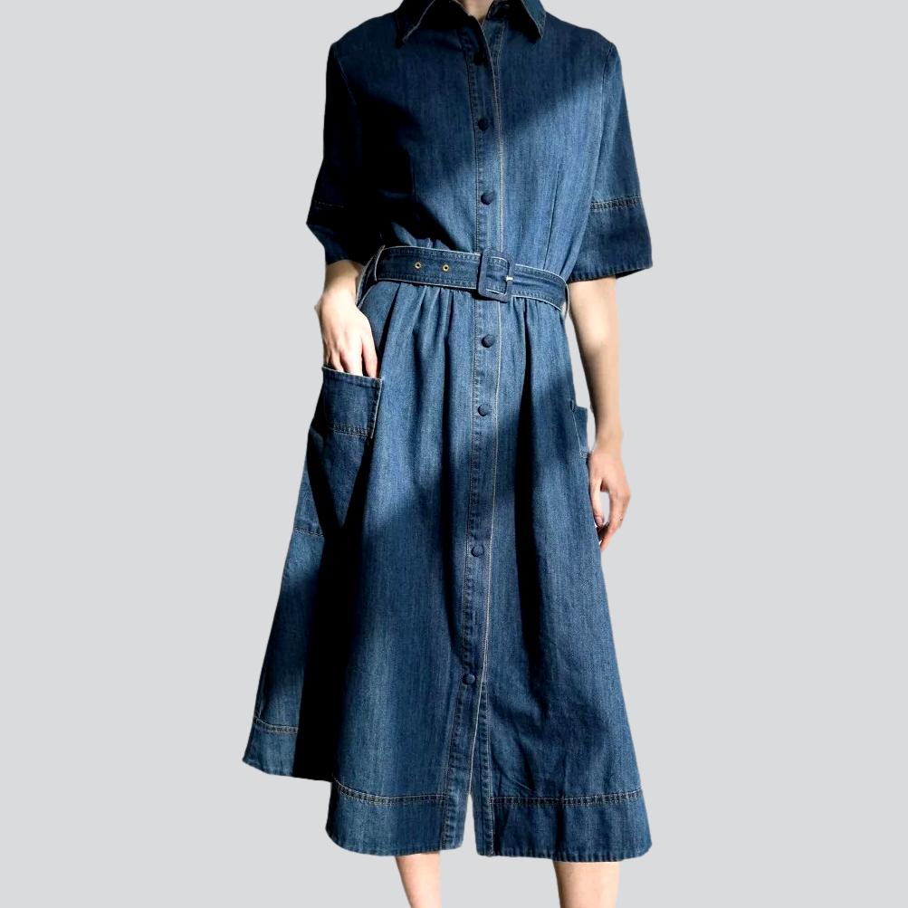 ¡Este vestido es una obra de arte en sí mismo! Su corte holgado y su tejido de lavado medio ofrecen un corte informal y desenfadado. Además, sus sofisticadas mangas cortas y su cierre de botones y cinturón le dan un toque único a tu estilo. Perfecto para la fashionista de alta costura con un toque nostálgico.