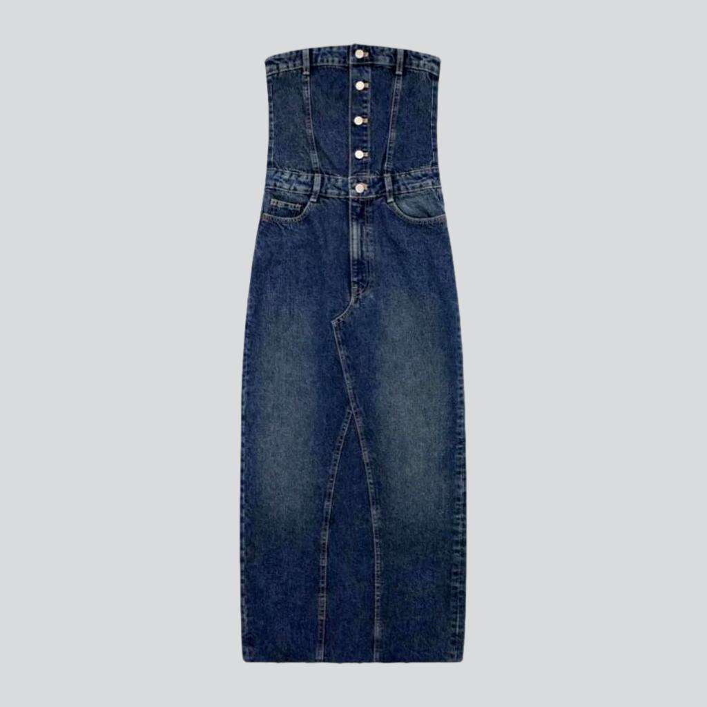 Presentamos la Colección de Verano 2023: ¡un vestido de mezclilla sin tirantes con lavado medio y un toque vintage! Esta elegante y clásica prenda está diseñada para que te veas y te sientas de maravilla, con una combinación de alta costura contemporánea y estilo convencional. Entra al verano con un look que te convertirá en la estrella de cualquier evento.
