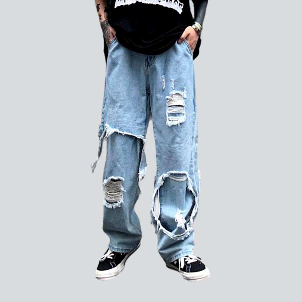 Desata el poder de la nostalgia con nuestros jeans rotos para hombre de la colección Otoño 2023. Presentan un corte tradicional de tiro medio, cierre de cremallera y botón, y un diseño único de mezclilla desgastada, holgada y con capas que marcará tendencia en cualquier ocasión. Características distintivas:
