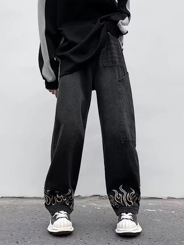 Descripción: Estos jeans de mezclilla para chico de ciudad tienen detalles de paneles en la pierna. Presentan bolsillos funcionales y llamas bordadas en los puños. Terminados con un diseño de cierre de cremallera con botón de metal.