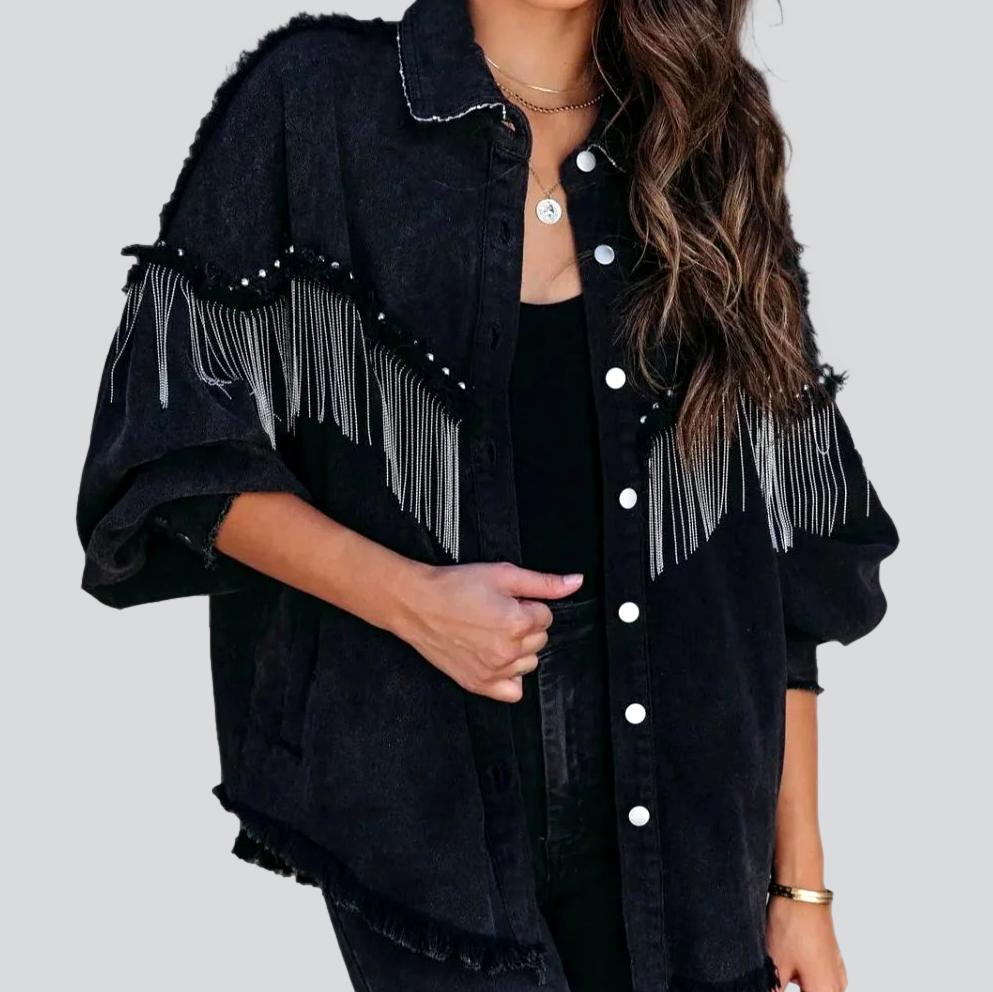 Chaqueta vaquera oversize con flecos para mujer disponible online: una chaqueta vaquera excepcional de la colección Primavera-Verano 2023. Demuestra tu gusto por lo clásico con el estilo vaquero Y2K. Esta tendencia atemporal ofrece la valiosa ventaja de la adaptabilidad, preparándote para cualquier ocasión.